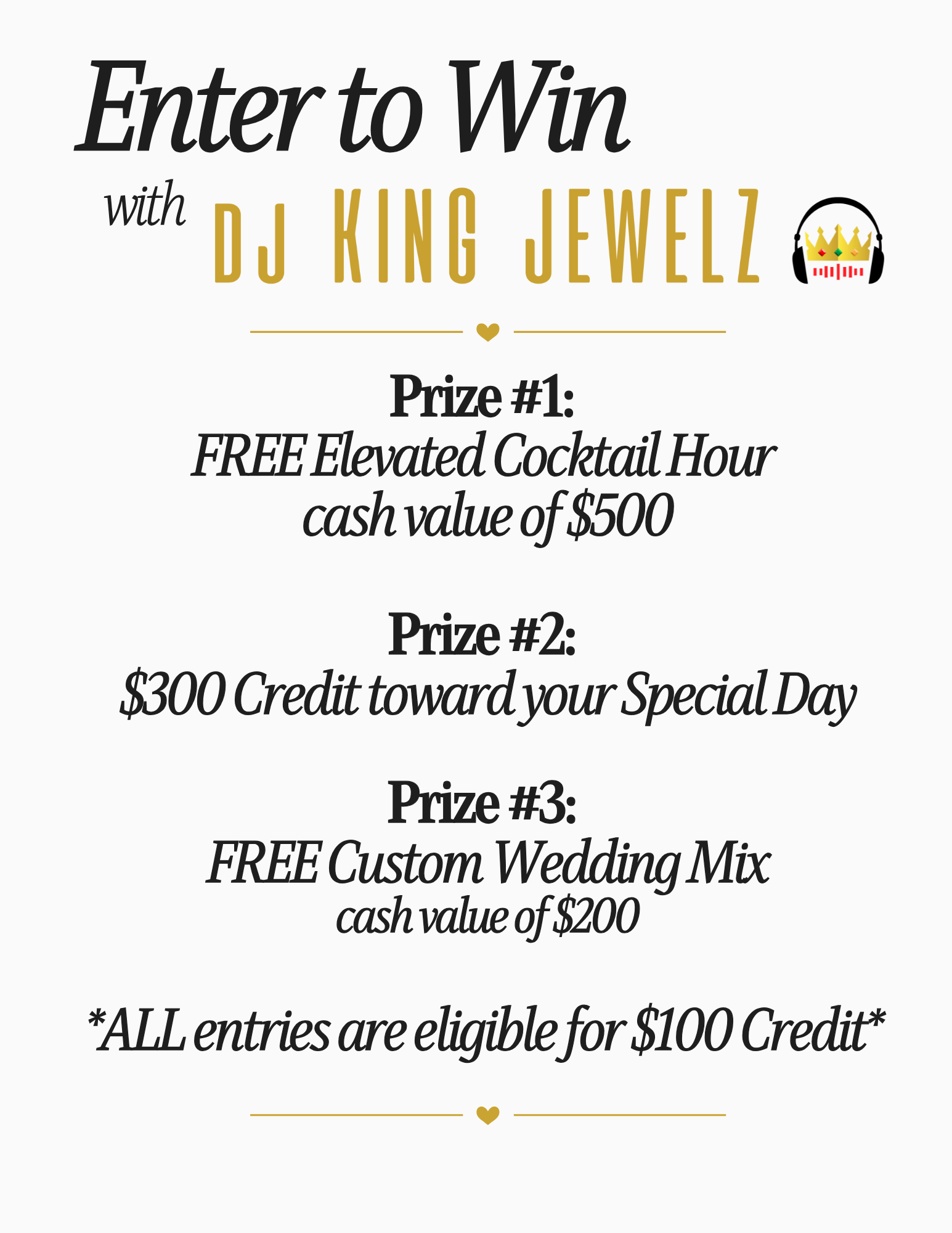 The first prize package includes a complimentary cocktail hour upgrade valued at $500. This service provides professional sound equipment, wireless setup, and curated background music for your cocktail hour in addition to your main reception setup. This upgrade reflects the cost of added equipment transport, additional setup time, and customized music planning to ensure seamless sound coverage while guests transition between spaces. This prize must be used in conjunction with a booked wedding DJ package and is not available as a standalone service.